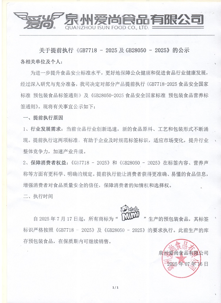 关于提前执行《GB7718-2025及GB28050-2025》的公示